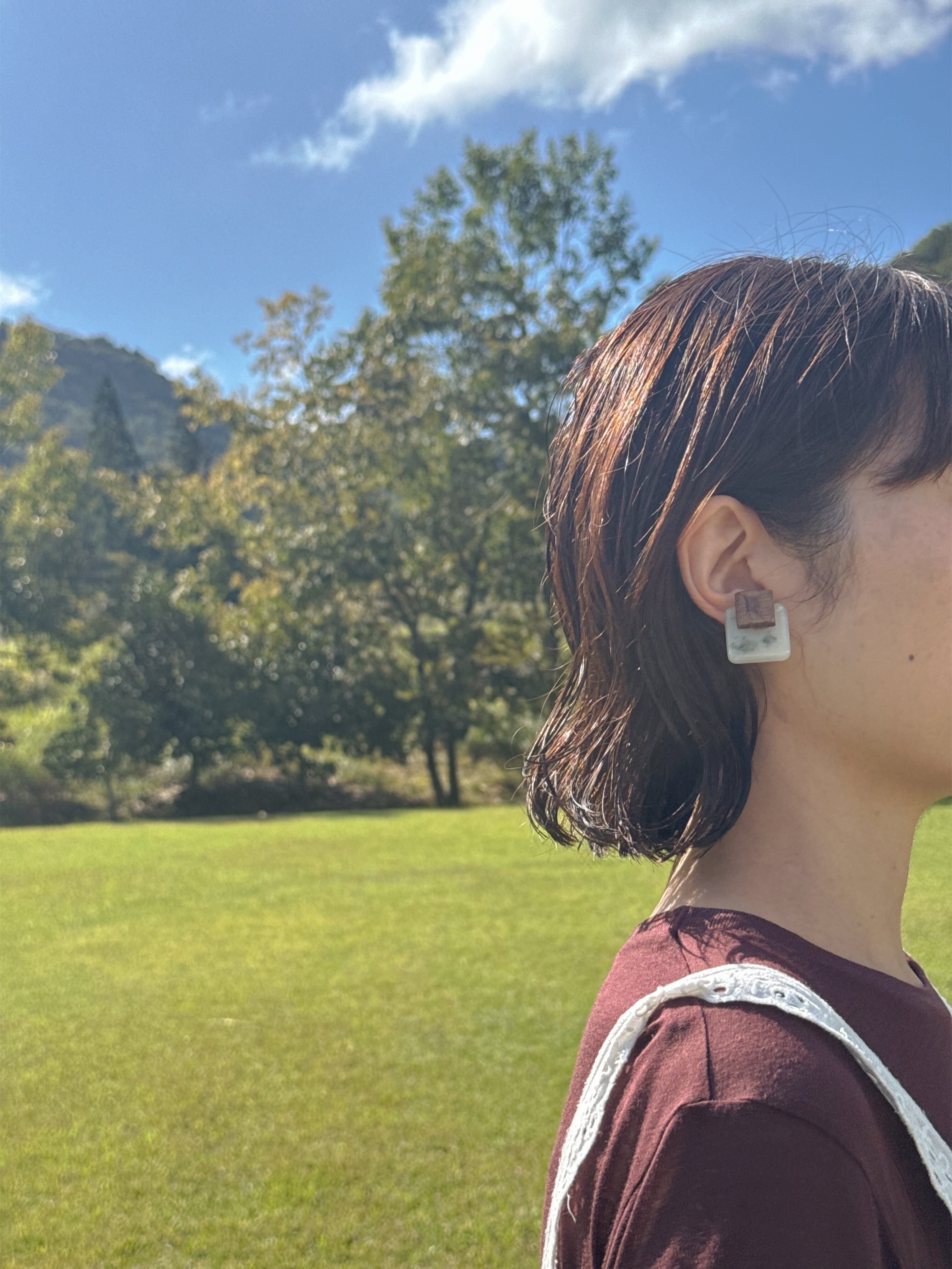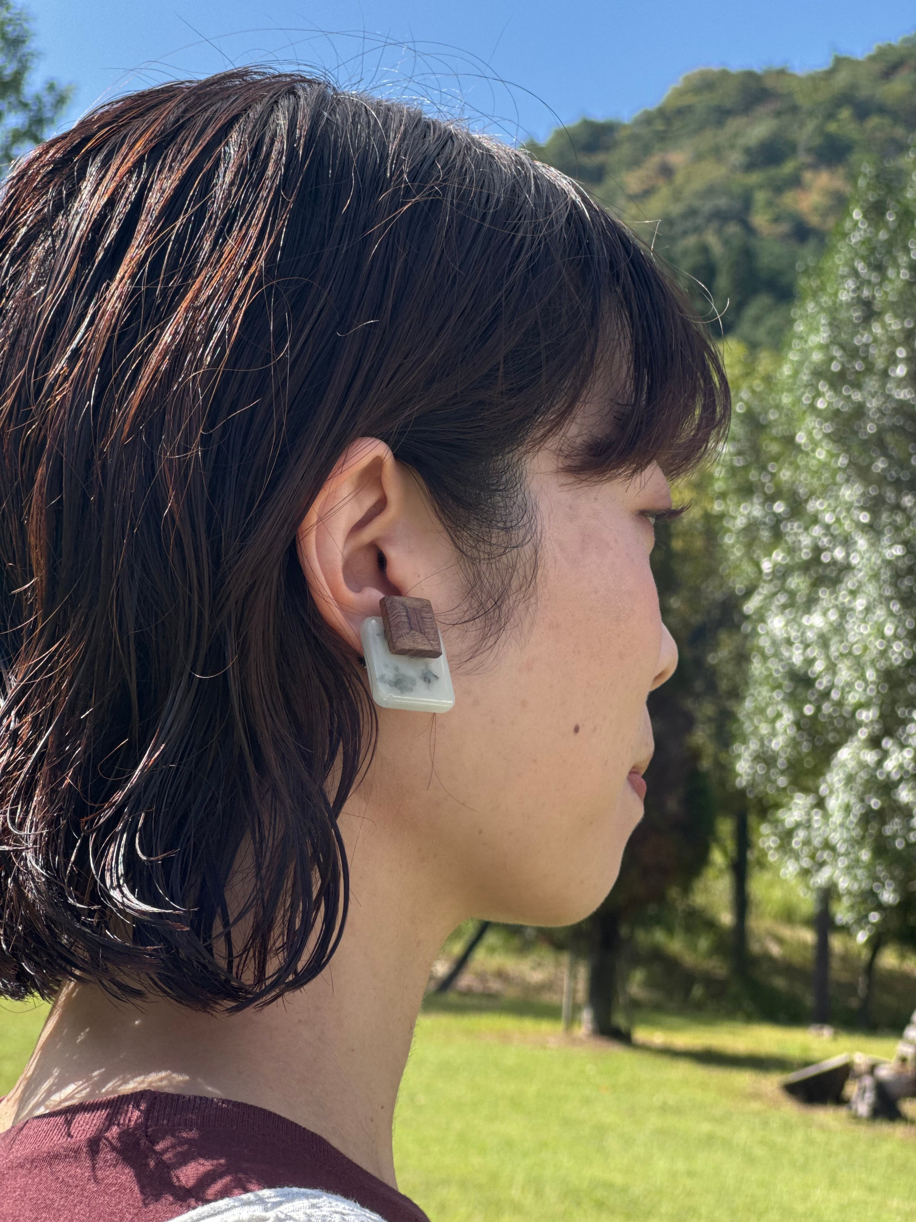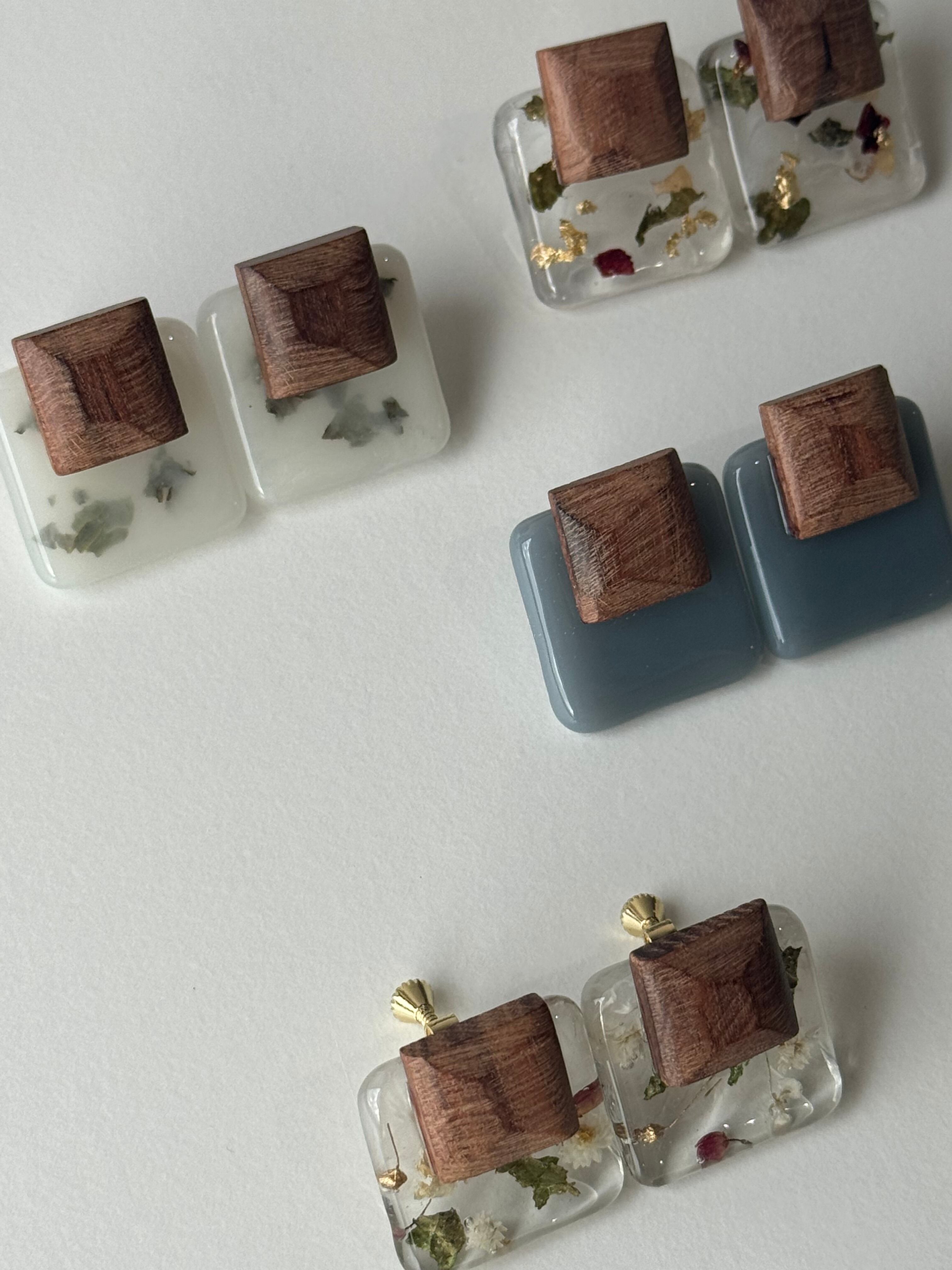 1. 【ナチュラル&モダンな異素材MIX】 ぬくもりを感じる天然木と、透明感のある樹脂の組み合わせが、合わせやすいのに地味にならない、洗練された耳元を演出します。