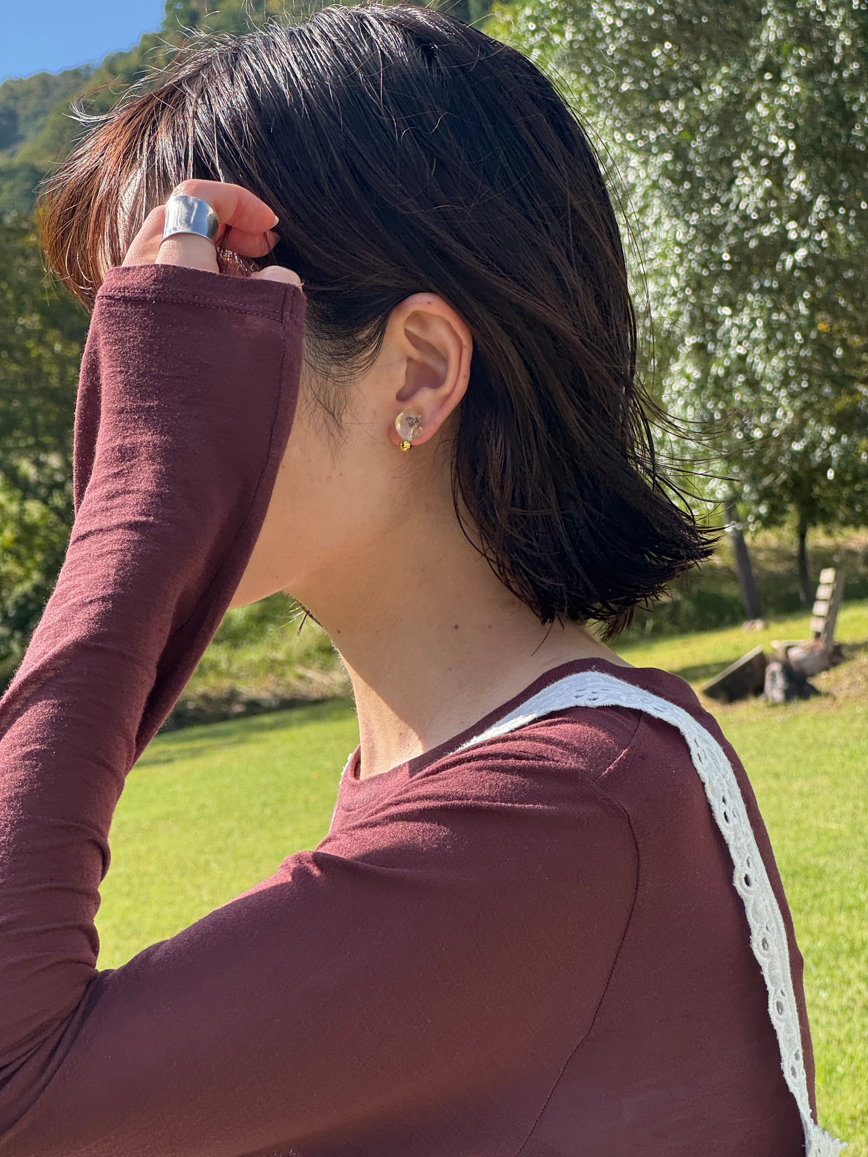 • 【飽きのこない輝き】 ドロップのようなモチーフが光を受けて艶めき、あなたの顔周りにさりげない輝きを添えます。